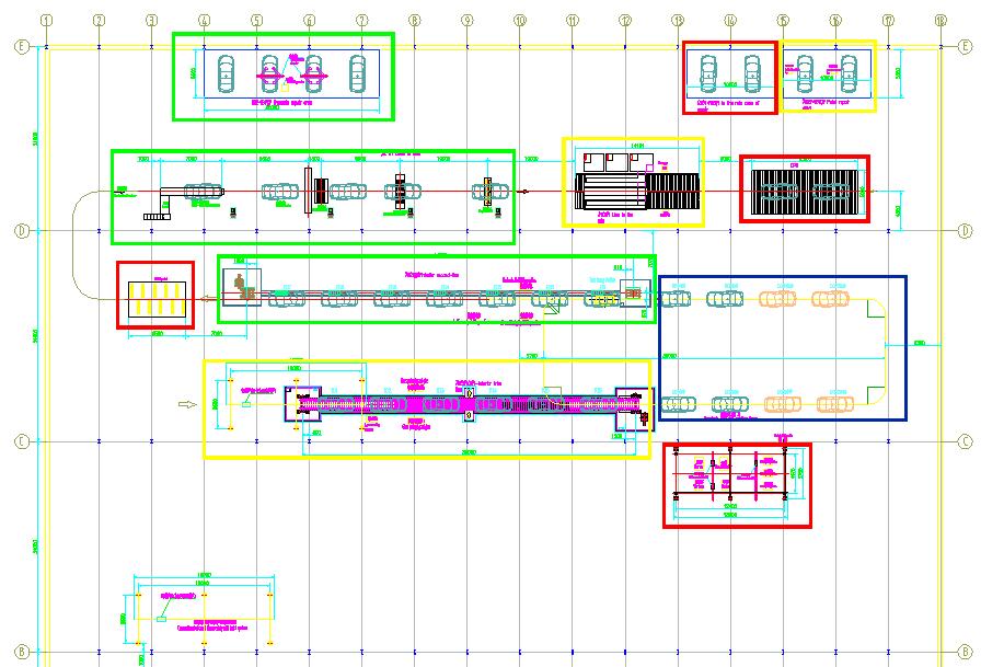 底盤線EMS、內飾線板鏈、終裝線板鏈、淋雨房、加注設備、補漆室、檢測線、AUDIT、工具等。