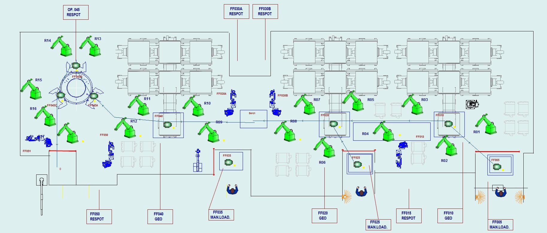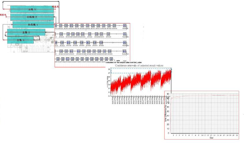 運用Plant Simulation物流仿真模擬軟件對產線建模仿真,調整緩存BUFFER容量或工藝瓶頸分析,從而實現(xiàn)產線的開通率和穩(wěn)定節(jié)拍。