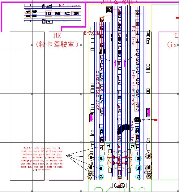 The main welding line has a total of 13 stations, and adopts the form of lifting roller + skid conveying; The bodyside assembly line adopts manual pre-assembly line, the front top beam and the back top beam use manual pre-assembly line, and the top cover assembly line adopts manual sling line. The engine assembly, front bottom plate assembly and rear bottom plate assembly are equipped with lifting gear.
